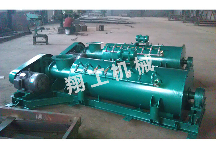 雙軸攪拌機(jī)主要由機(jī)殼、螺旋軸總成、驅(qū)動(dòng)裝置、配管、蓋板、鏈罩等部件組成。