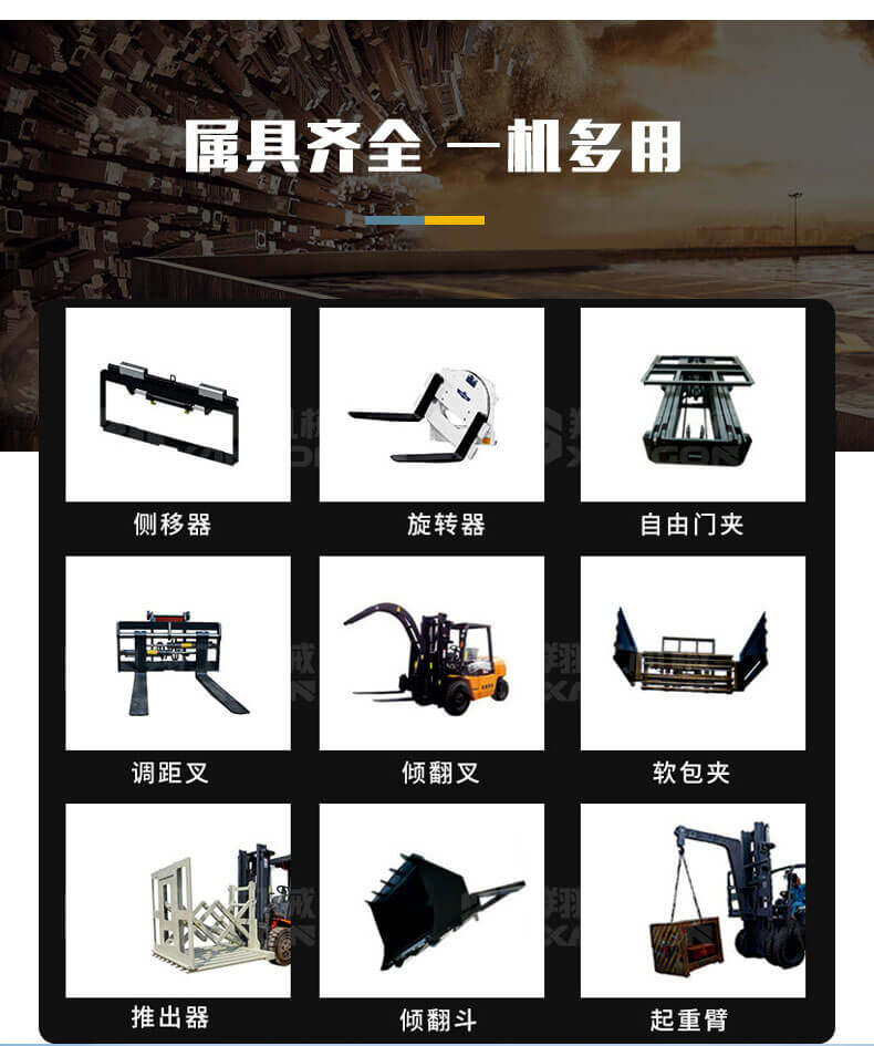 越野叉車(chē)可以在坡地和不平地面上進(jìn)行貨物裝、卸、堆垛及搬運(yùn)作業(yè),具有良好的機(jī)動(dòng)性、越野性可靠性。其功能多樣,可搭配側(cè)移器、調(diào)距叉、旋轉(zhuǎn)器、軟包夾、推出器、側(cè)翻叉、側(cè)翻斗、起重臂等工具完成不同的工作。