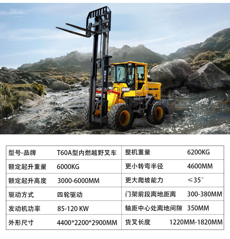 5.越野叉車(chē)發(fā)動(dòng)機(jī)功率大,采用全輪驅(qū)動(dòng)和越野輪胎。