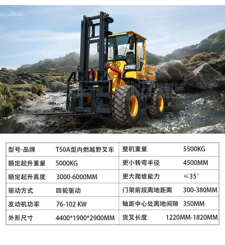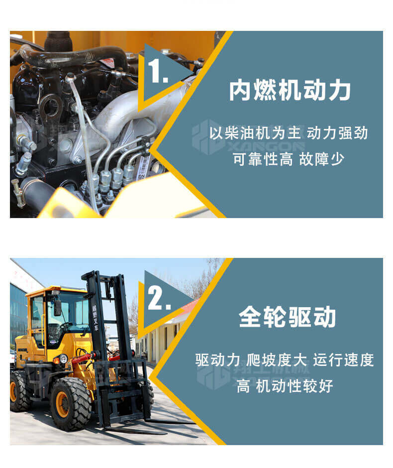 5.越野叉車發(fā)動機(jī)功率大,采用全輪驅(qū)動和越野輪胎。