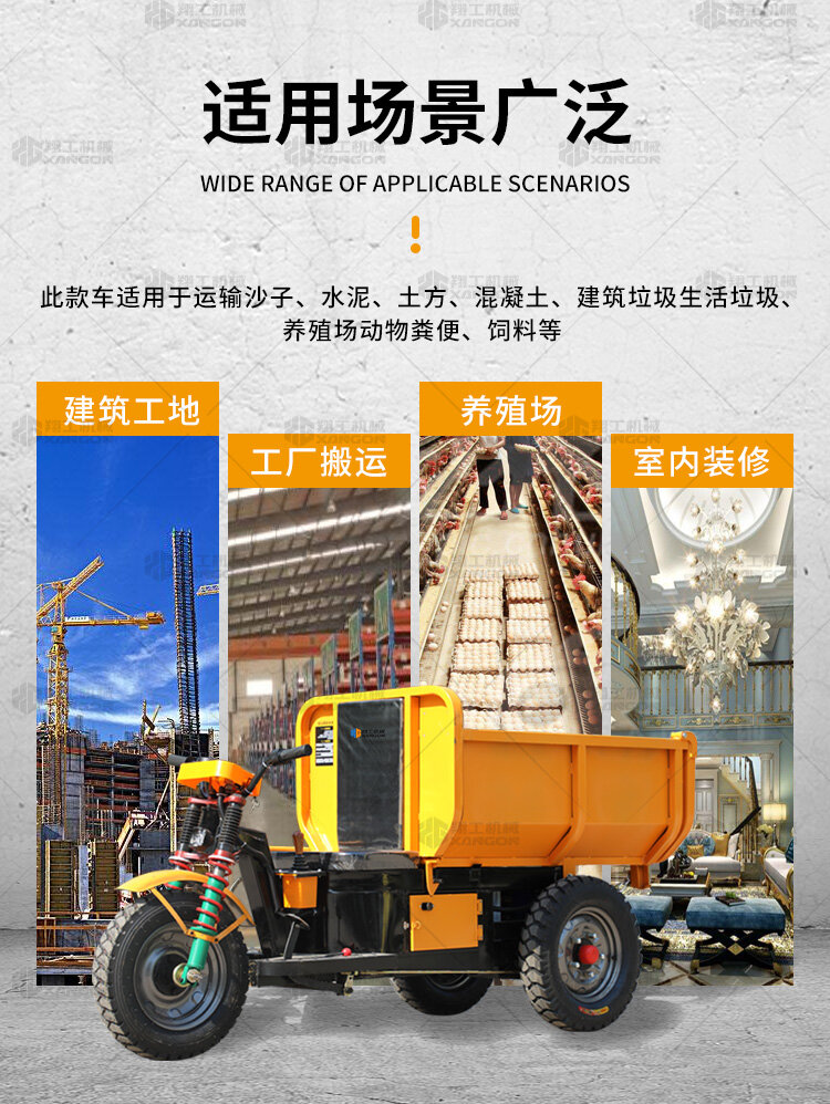 此款車適用于建筑工地、室內(nèi)裝修、養(yǎng)殖場、工廠等場所,運輸沙子、水泥、土方、混凝土、建筑垃圾生活垃圾、養(yǎng)殖場動物糞便、飼料等,體積小操作簡單靈活,可原地360度轉(zhuǎn)圈,可進(jìn)入樓層、樓道、電梯、吊籃等各種狹小空間作業(yè),是您必不可少的裝卸助手。