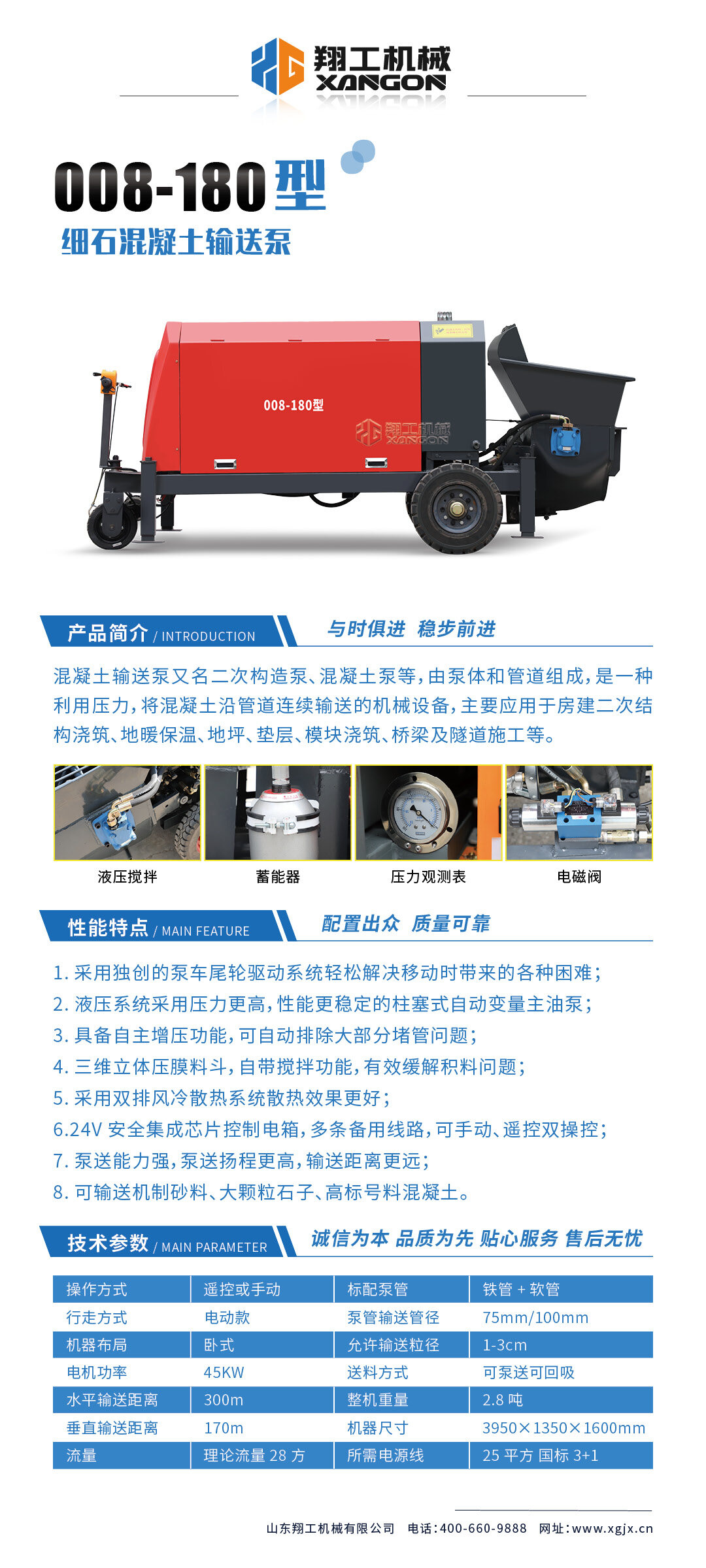 采用獨(dú)創(chuàng)的泵車尾輪驅(qū)動系統(tǒng)輕松解決移動時(shí)帶來的各種困難;采用雙排風(fēng)冷散熱系統(tǒng)散熱效果更好,液壓系統(tǒng)采用壓力更高,性能更穩(wěn)定的柱塞式自動變量主油泵,采用先進(jìn)的三維立體壓模一體式自動攪拌料斗可輸送機(jī)制砂,高標(biāo)號混凝土,有效緩解積料問題。