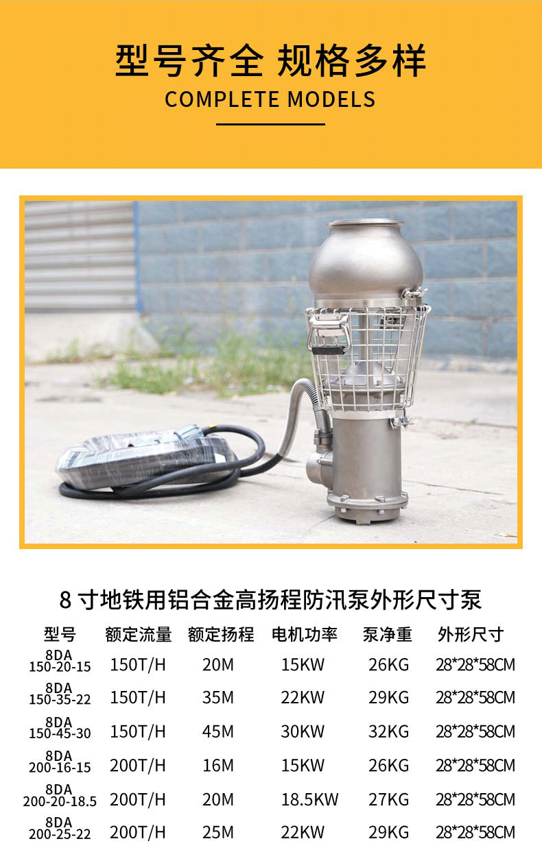 8寸地鐵防汛泵,鋁合金材質(zhì),高揚(yáng)程設(shè)計,排水高效,耐腐蝕性強(qiáng),輕便易移動,專用于地鐵防汛搶險,保障地下空間安全。